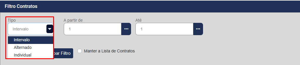 Será apresentada a tela para que você defina de quais contratos deseja realizar a impressão do Recibo de Cesta Básica, o Tipo poderá ser Intervalo, Alternado ou Individual