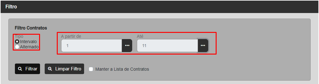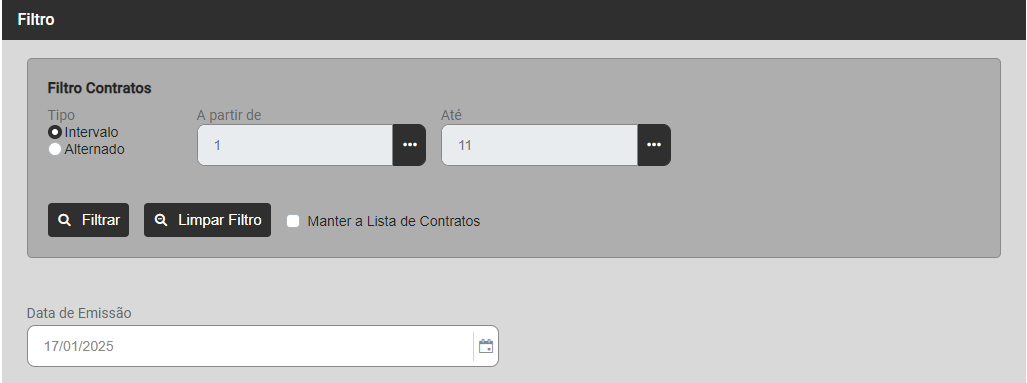 Será apresentada a tela para que você defina o Filtro dos Contratos que terá o Termo gerado, o filtro poderá ser: