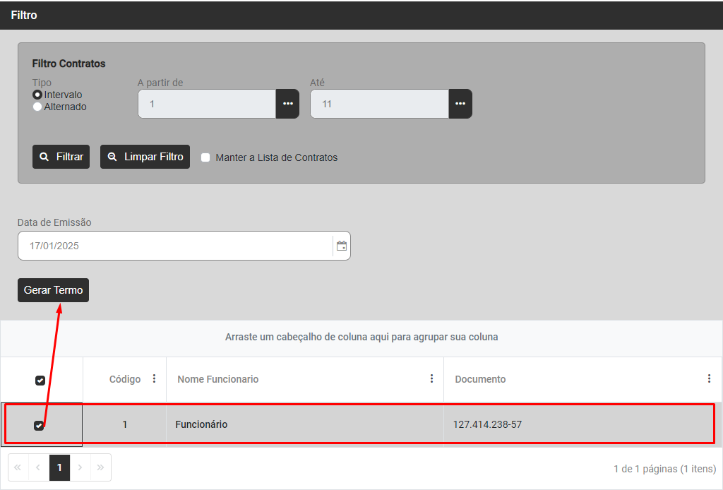 Clique em Filtrar e o Módulo apresentará na parte inferior da tela os Contrato filtrados, selecione o Contrato e clique em Gerar Termo