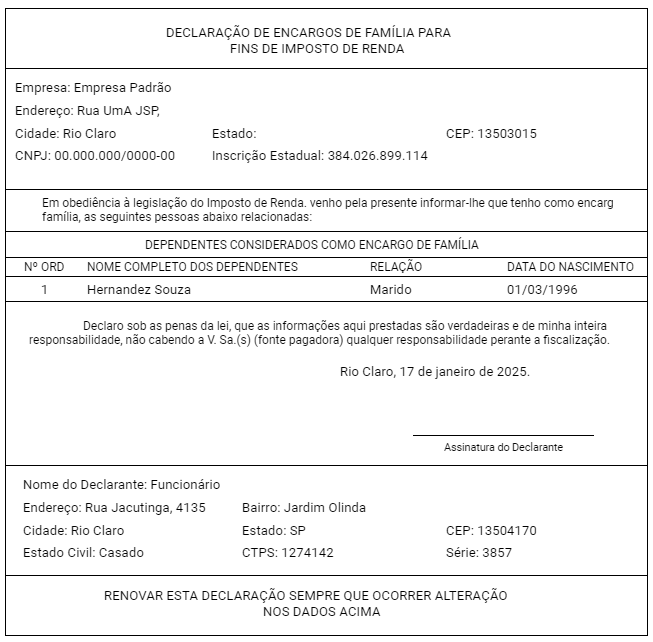 A Declaração de Encargos de Família para Fins de Imposto de Renda será apresentada