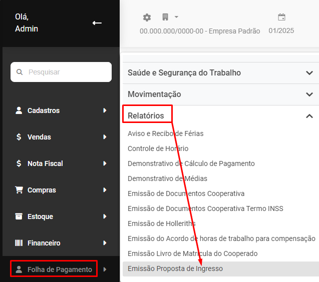 Para realizar a impressão da Proposta de Ingresso na Cooperativa acesse o menu Folha de Pagamento>Relatórios>Emissão Proposta de Ingresso
