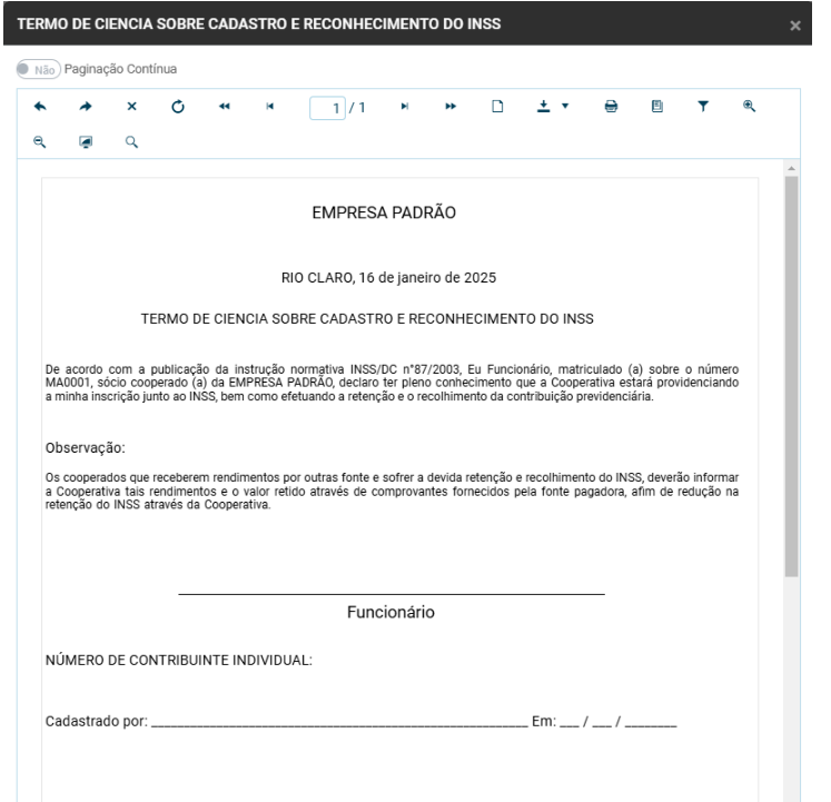 .... Emissão/Impressão de Documentos de Cooperativa Termo INSS (menus oculto V)
