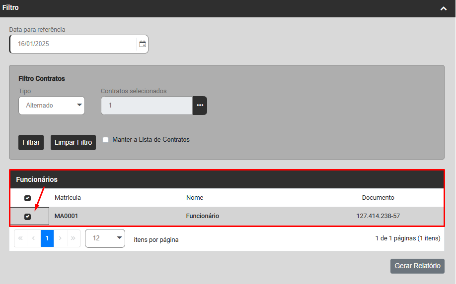 Ao clicar em Filtrar as informações do trabalhador definido ficarão na parte inferior da tela, selecione o trabalhador