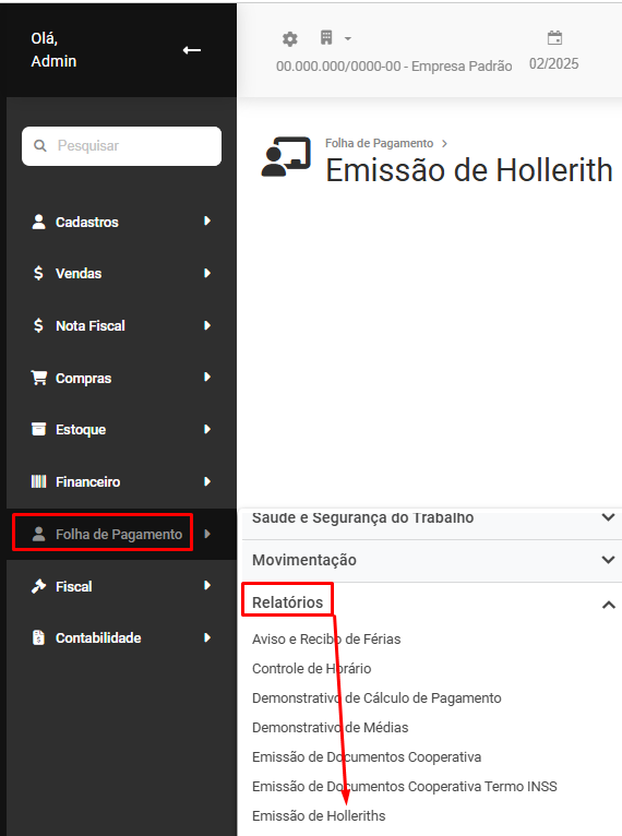 Para realizar a impressão dos Holleriths dos trabalhadores, acesse o menu Folha de Pagamento>Relatórios>Emissão de Holleriths