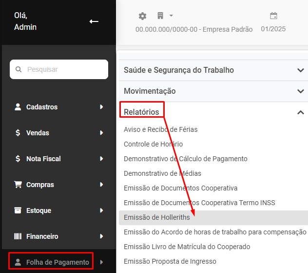 Para realizar a impressão dos Holleriths dos trabalhadores, acesse o menu Folha de Pagamento>Relatórios>Emissão de Holleriths