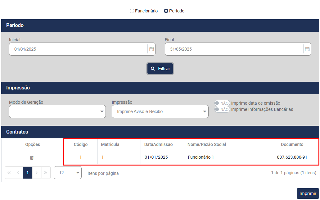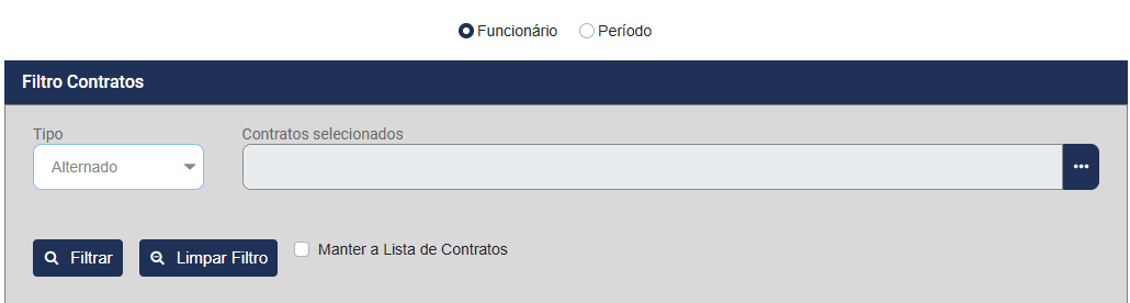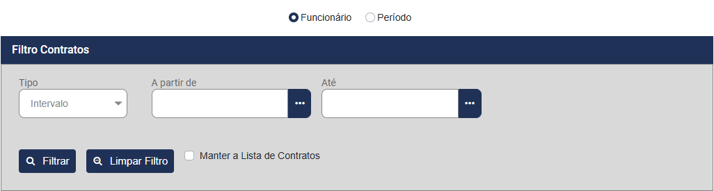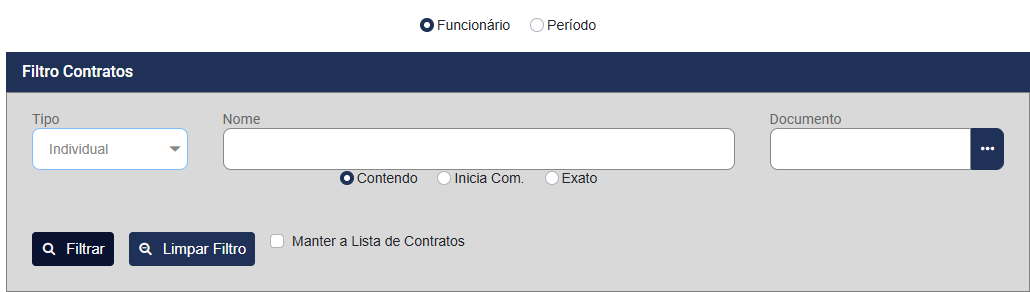 O Módulo apresentará a tela para que você defina o Filtro de Contratos que terão seus Avisos e Recibos de Férias Impressos
