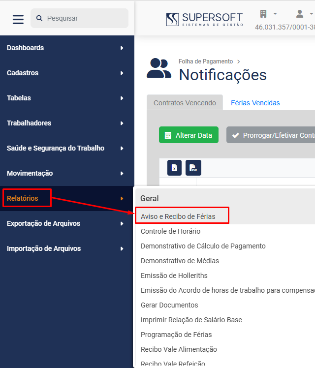 Para que você faça a Impressão do Aviso e Recibo de Férias deverá acessar o menu menu Folha de Pagamento>Relatórios>Aviso e Recibo de Férias