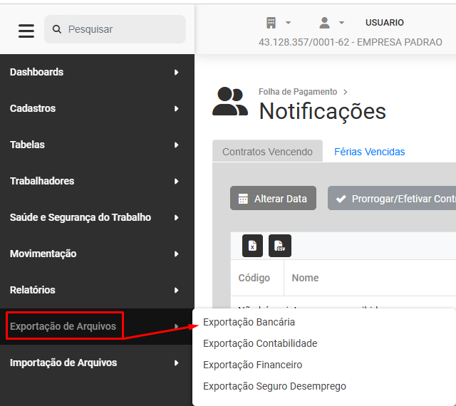 Para que você faça gere o arquivo de exportação de valores para o Banco, acesse o menu Folha de Pagamento>Exportação de Arquivos>Exportação Bancária