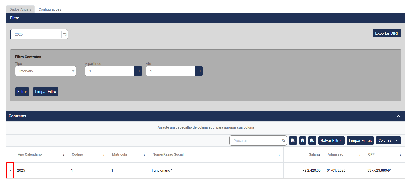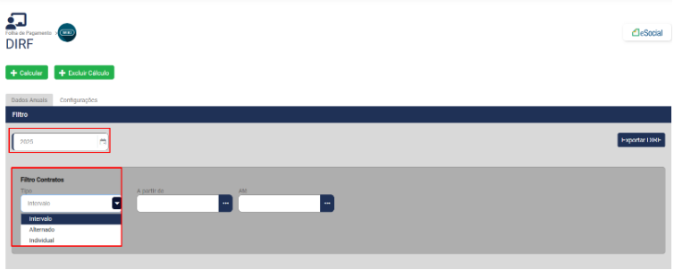 Defina o Ano Calendário e filtre pelos trabalhadores que você deseja gerar a DIRF