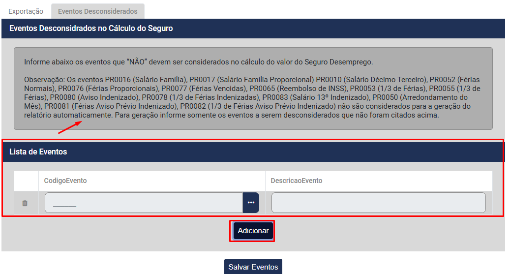 Defina quais serão os eventos que não devem ser considerados no cálculo do valor do Seguro Desemprego