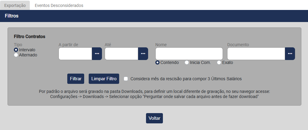 Na aba Exportação, clique em Filtrar e será apresentada na parte inferior da tela os contratos que terão o arquivo gerado