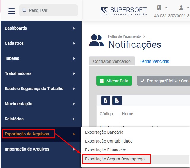 Para que você realize a Exportação para o Seguro Desemprego acesse o menu Folha de Pagamento>Exportação de Arquivos>Exportação Seguro Desemprego