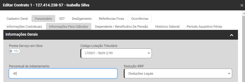 b) Cadastro do Contrato do Trabalhador aba Funcionários>Informações para Cálculo, campo Percentual de Adiantamento