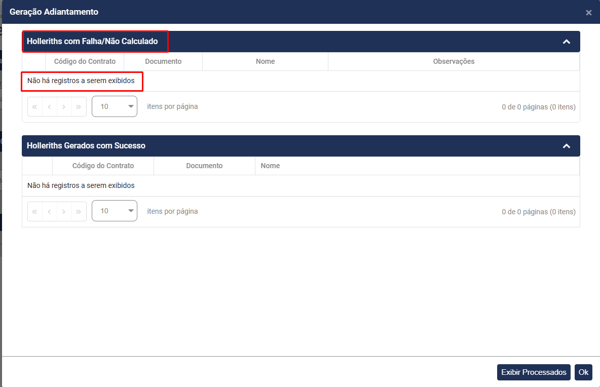 Após a geração do hollerith o Sistema não apresentará relação com holleriths com falha/não calculados nem a relação de funcionários com os holleriths gerados pois não existe definição do percentual do Adiantamento Salarial