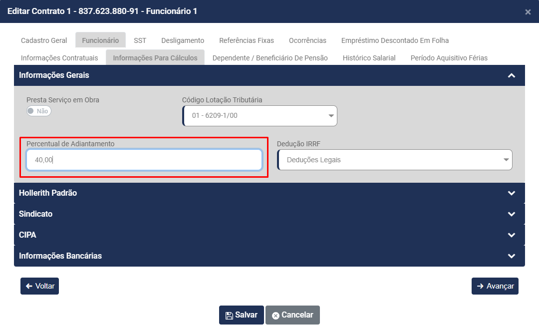 b) Se NÃO for o mesmo Percentual para todos os funcionários - Edite o Cadastro do Contrato do Trabalhador no menu menu Folha de Pagamento>Trabalhadores>Dados Contratuais aba Funcionários>Informações para Cálculo, informe o campo Percentual de Adiantamento