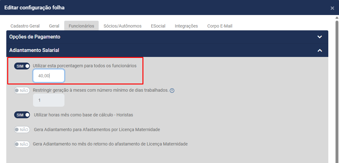 a) Se for o mesmo Percentual para todos os funcionários -  Acesse o menu Configurações>Folha - edite a configuração na aba Funcionários>Adiantamento Salarial, campo Utilizar essa porcentagem para todos os funcionários e informe o percentual para Todos os Funcionários