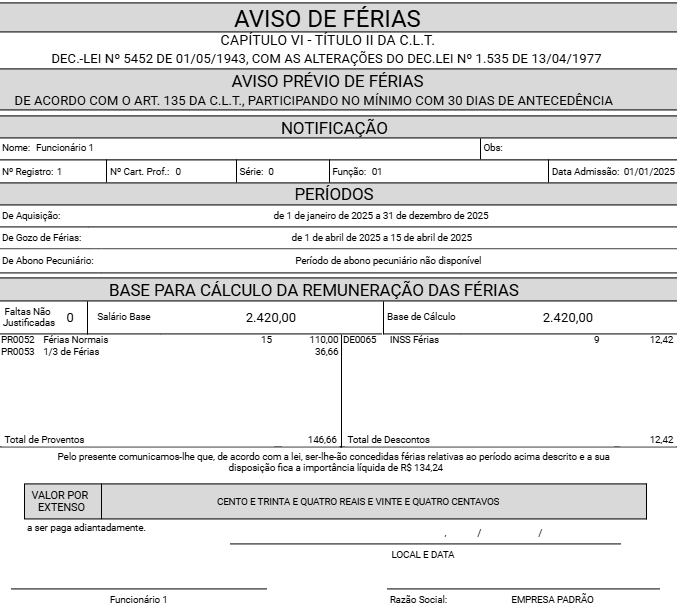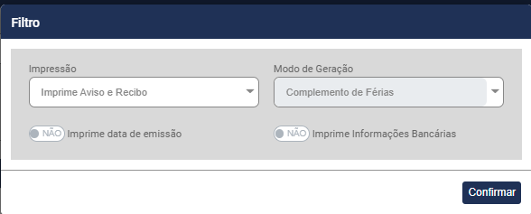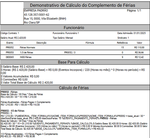 Ao clicar em Relatório você verá a tela com o Filtro realizado e o Recibo de Férias Complementares calculado