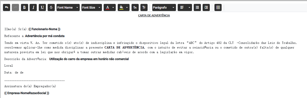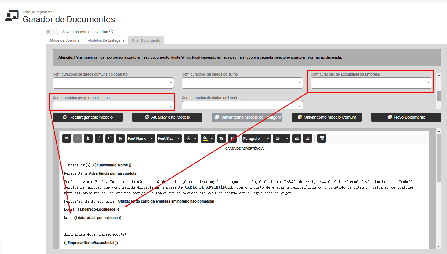 b) Em nosso Exemplo criaremos o Documento Carta de Advertência que tenho salvo em meu Computador, será necessário que você copie o texto e em seguida cole na tela apresentada pelo Módulo ou, se preferir poderá digitar o texto no corpo da aba Criar Documento