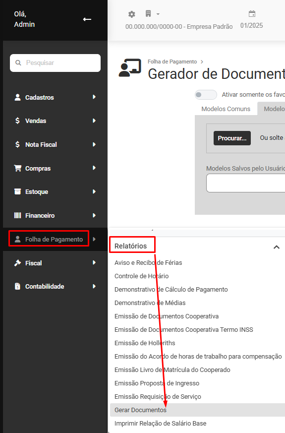 Para a Geração de Documentos você deverá acessar o menu Folha de Pagamento>Relatórios>Geração de Documentos