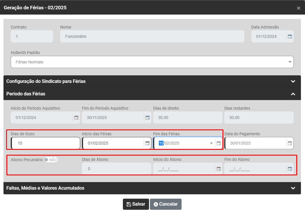 Você deverá definir a data de Início e fim das Férias