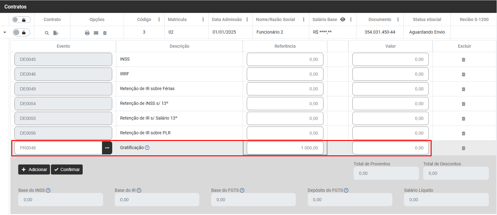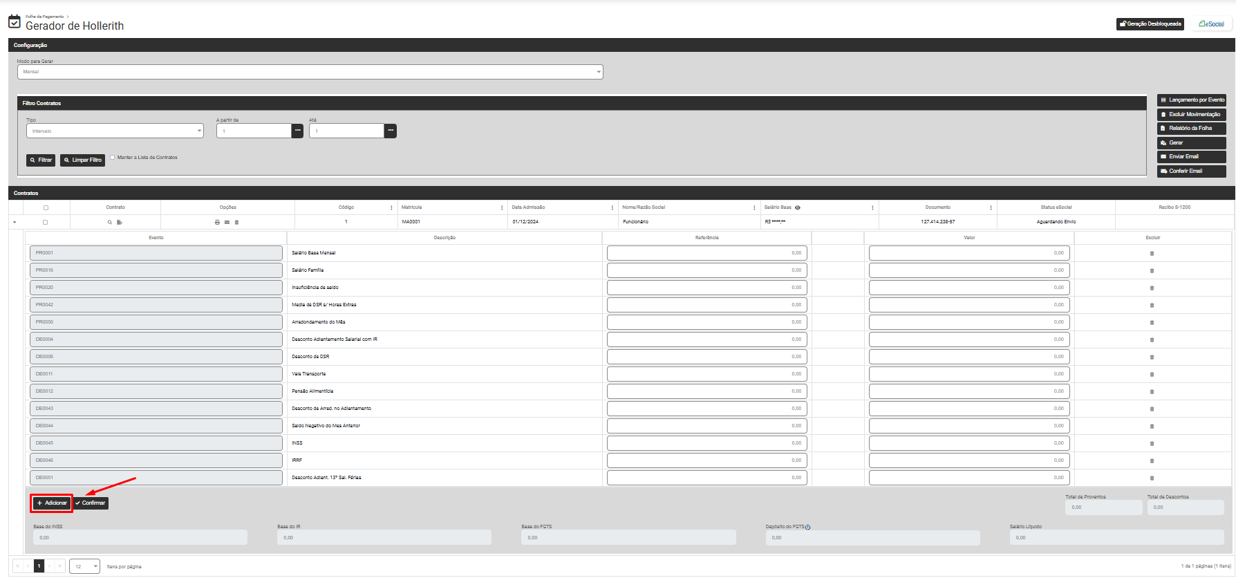 Para incluir eventos que não estão cadastrados no Hollerith Padrão do Funcionário nem em suas Referências Fixas, clique no Botão "Adicionar"
