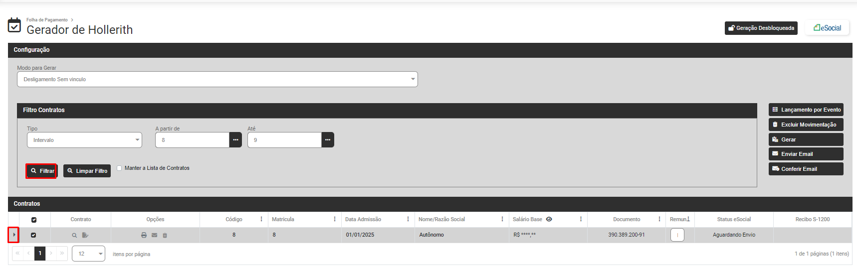 - Gerar - Gerar os Holleriths de acordo com o Modo definido dos Trabalhadores Sem Vínculo filtrados anteriormente