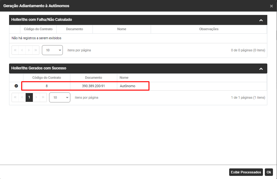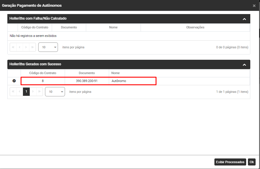 Faça novamente o Filtro dos Autônomos que tiveram a geração de hollerith realizada e para visualizar as informações geradas expanda as informações através do botão ao lado esquerdo dos dados do Autônomo