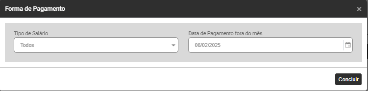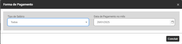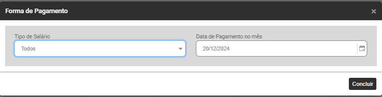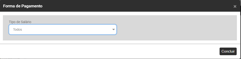 O Módulo apresentará a tela para definição da Forma de Pagamento, com o Tipo de Salário Todos já definido, clique em Concluir ou se desejar defina outro Tipo de Salário, você poderá realizar a geração apenas para os Contratos com Tipo de Salário: