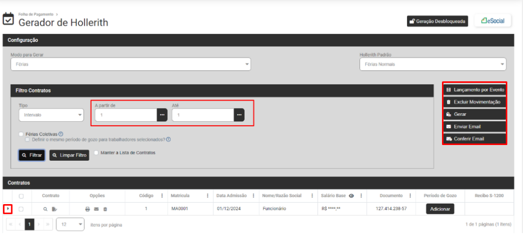 Para visualizar as informações geradas Filtre novamente e expanda as informações através do botão ao lado esquerdo dos dados do funcionário.