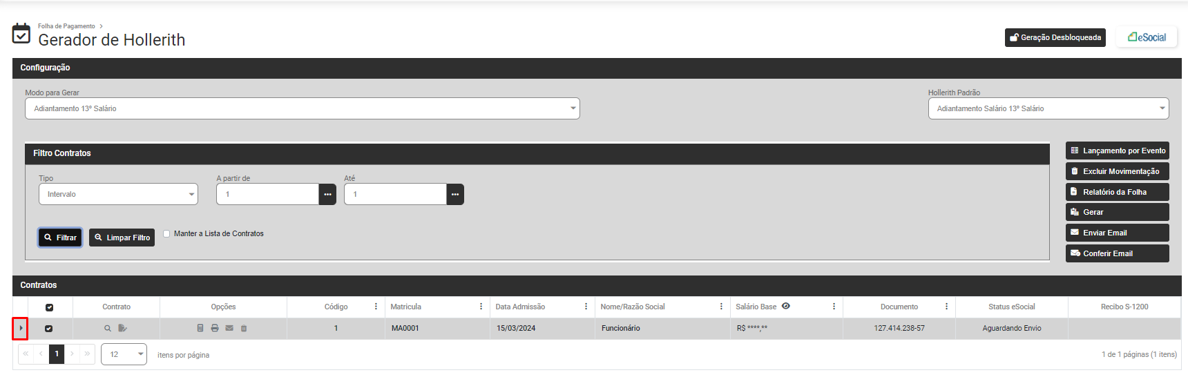 Faça novamente o Filtro dos Funcionários que tiveram a geração de hollerith realizada e para visualizar as informações geradas expanda as informações através do botão ao lado esquerdo dos dados do funcionário