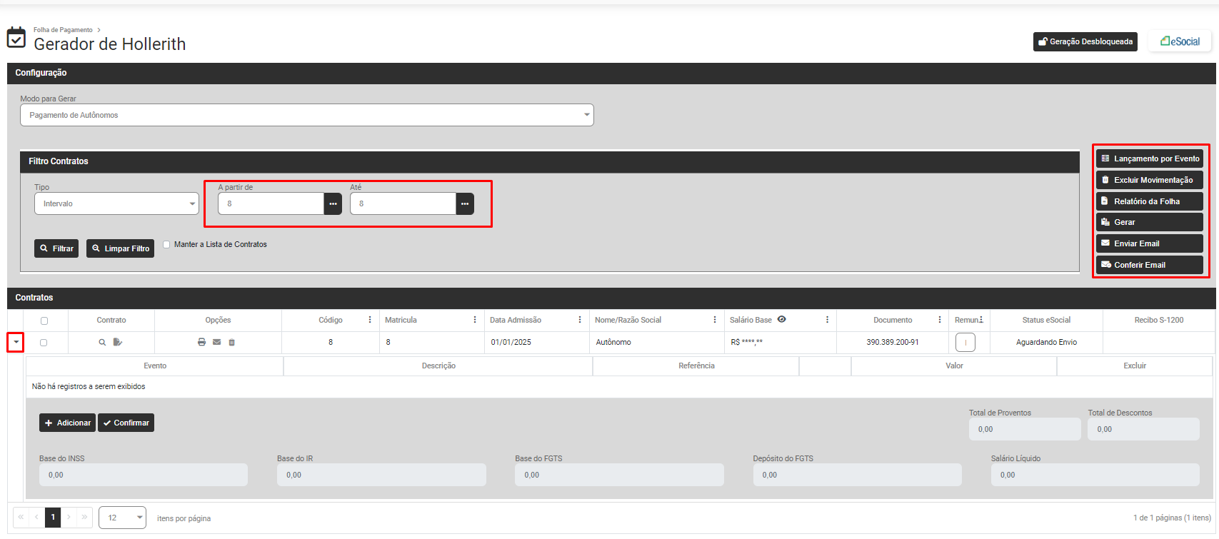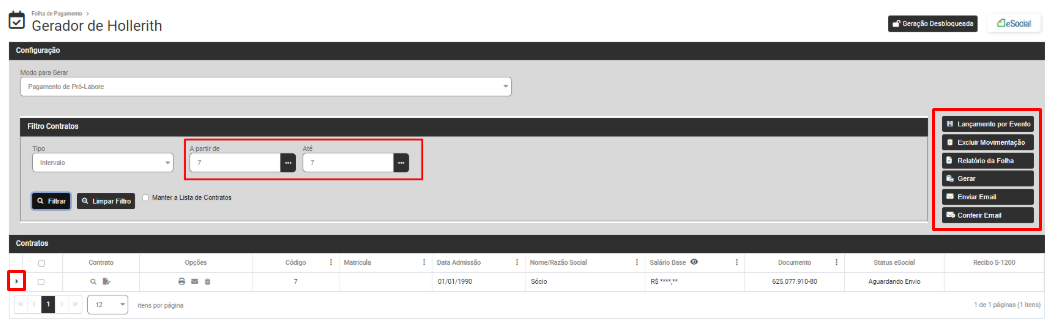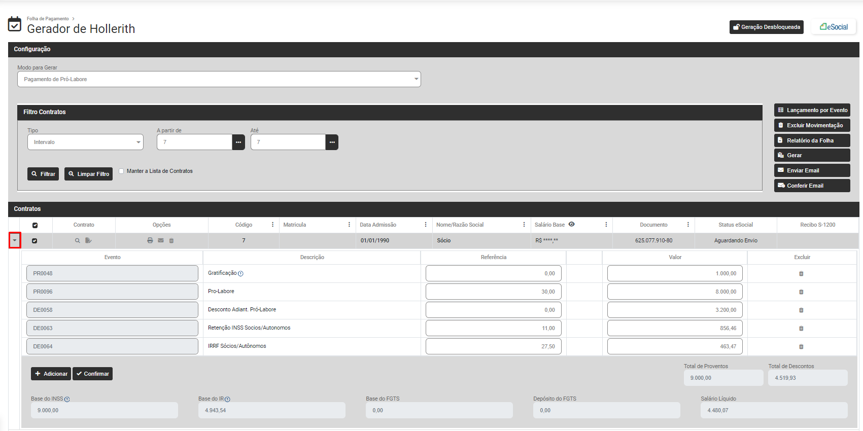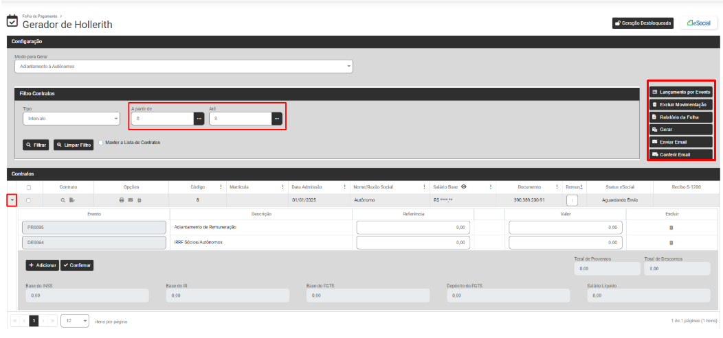 Defina os Contratos e clique em Filtrar e o Módulo trará na parte inferior da tela os dados dos Funcionários, Sócios ou Autônomo de acordo com o filtro realizado anteriormente (clique na seta existente na lateral esquerda da linha do funcionário, sócio ou autônomo para expandir as informações) e na lateral direita da tela você encontrará as opções: