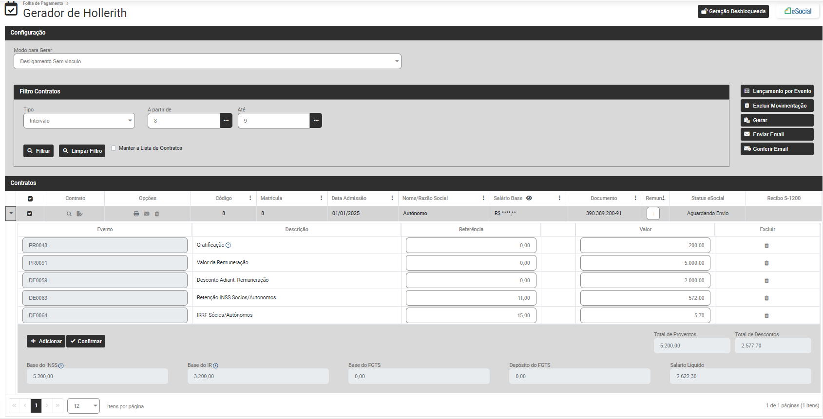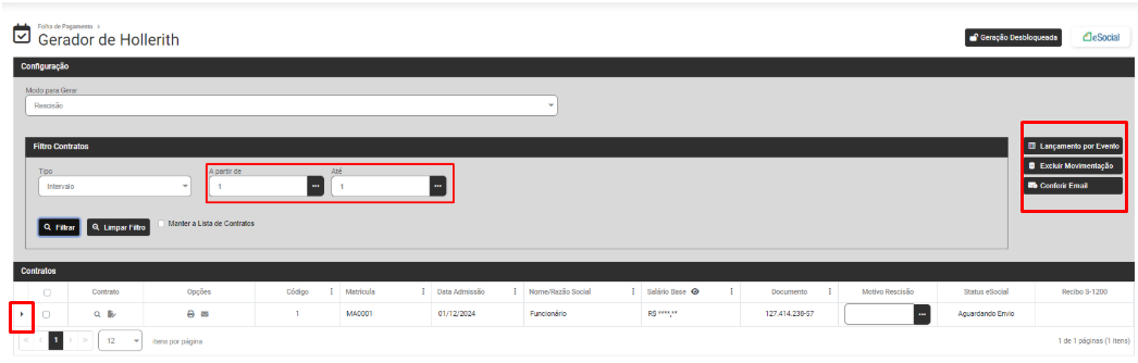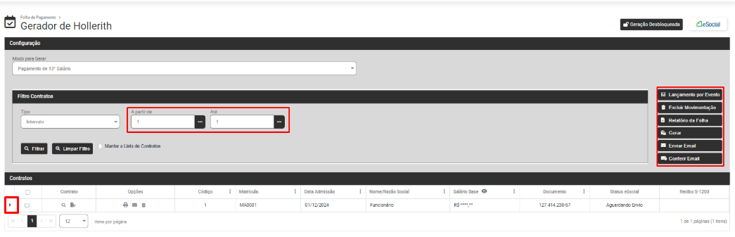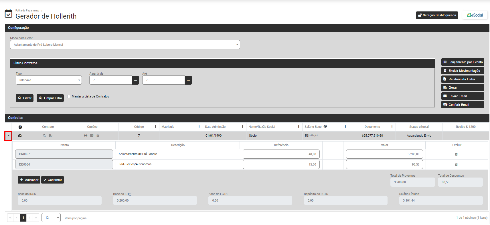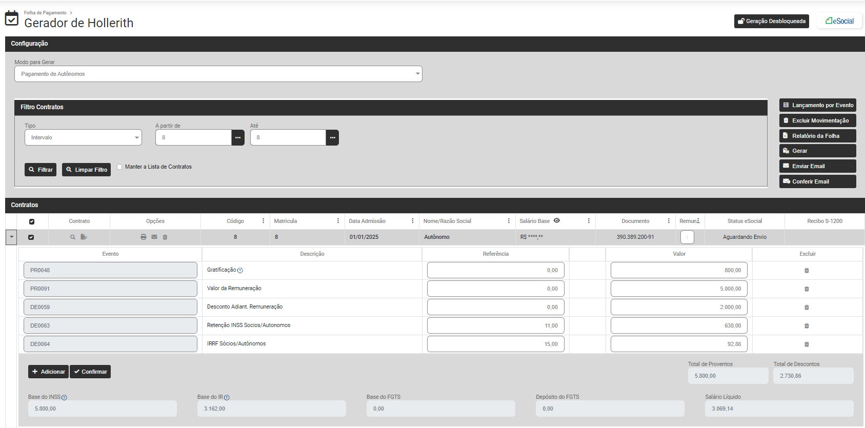 Defina os Contratos e clique em Filtrar e o Módulo trará na parte inferior da tela os dados dos Funcionários, Sócios ou Autônomo de acordo com o filtro realizado anteriormente (clique na seta existente na lateral esquerda da linha do funcionário, sócio ou autônomo para expandir as informações) e na lateral direita da tela você encontrará as opções: