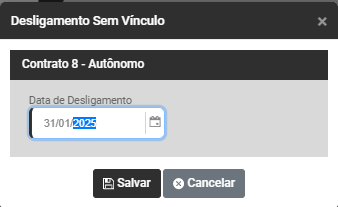 Agora clique em "Gerar" e será apresentada a Tela para definição da Data de Desligamento Sem Vínculo, digite a data e clique em Salvar