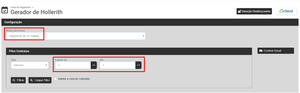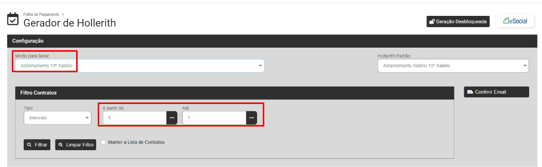 Para a Geração de Modo Mensal dos Funcionários de sua Empresa defina o Modo Mensal e o Sistema irá apresentar a tela para que você defina o Filtro dos Contratos que terão o Modo Mensal gerados.