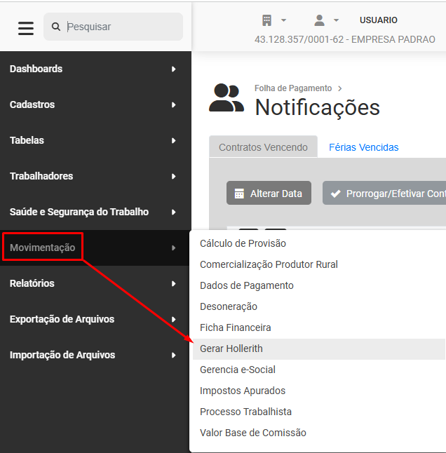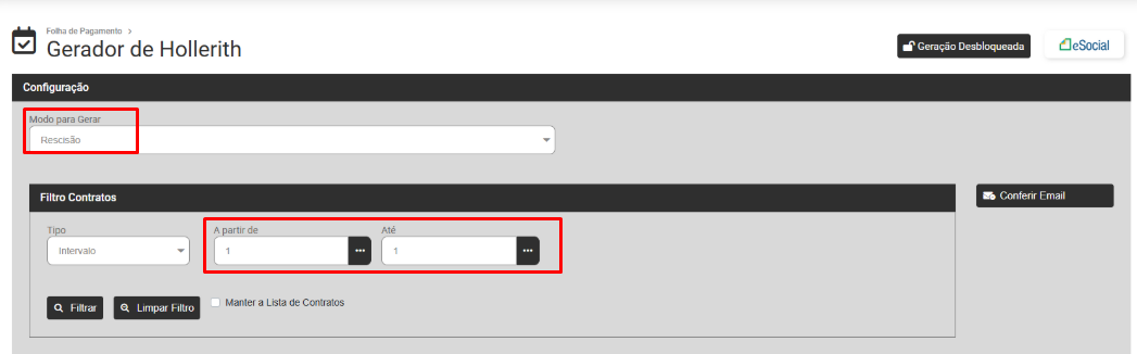 Você não conseguirá realizar a Geração dos Holleriths se os menus abaixo estiverem bloqueados: