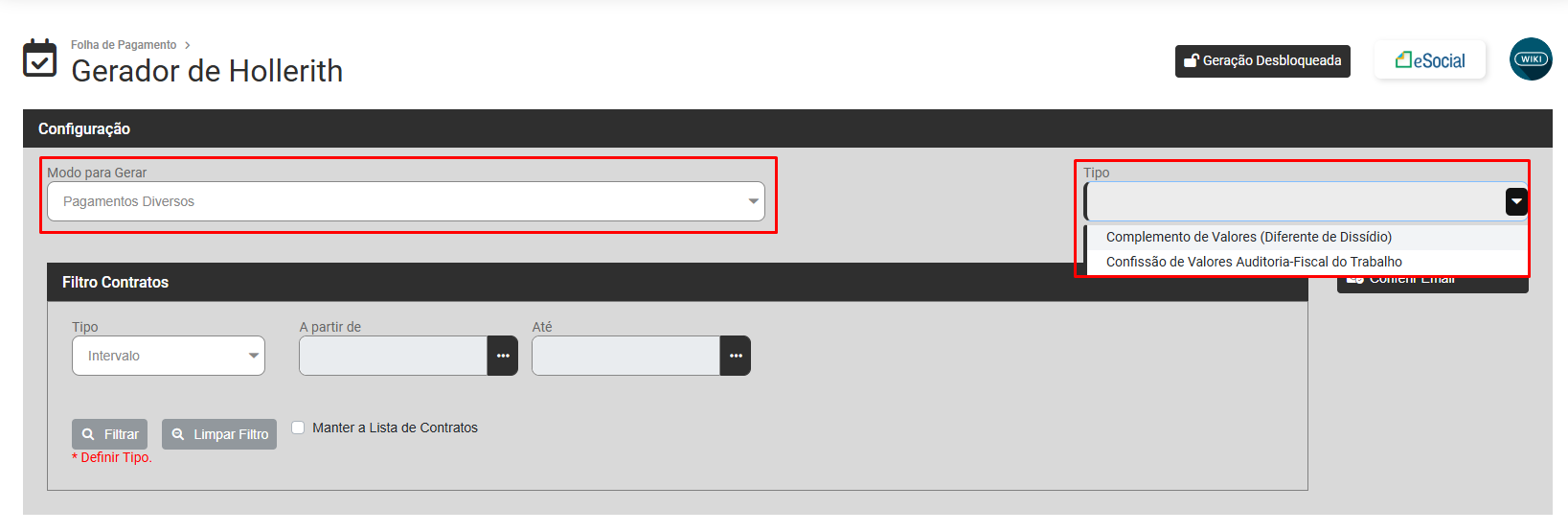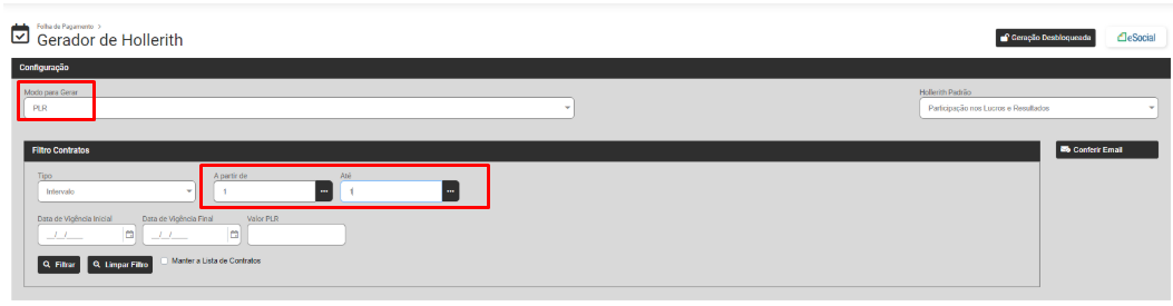 Para a Geração de Pagamento de Intermitente de sua Empresa defina o Modo Intermitente e o Sistema irá apresentar a tela para que você defina o Filtro dos Contratos que terão Pagamento de Intermitente gerados.