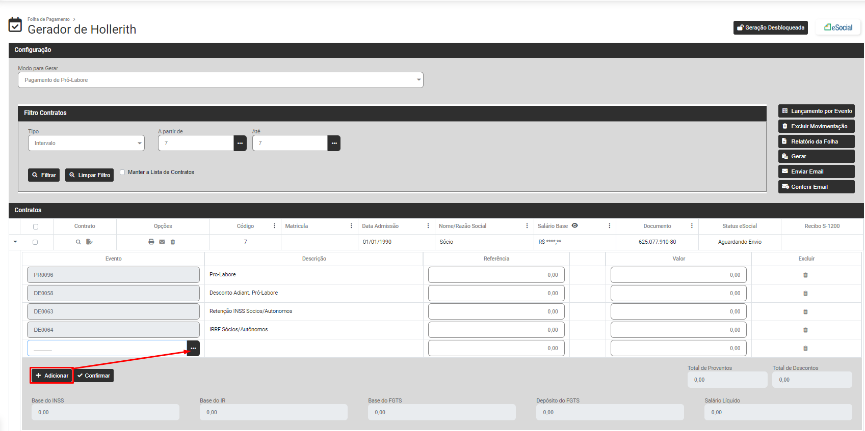 Para incluir eventos que não estão cadastrados no Hollerith Padrão do Autônomo nem em suas Referências Fixas, clique no Botão "Adicionar"