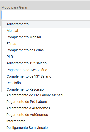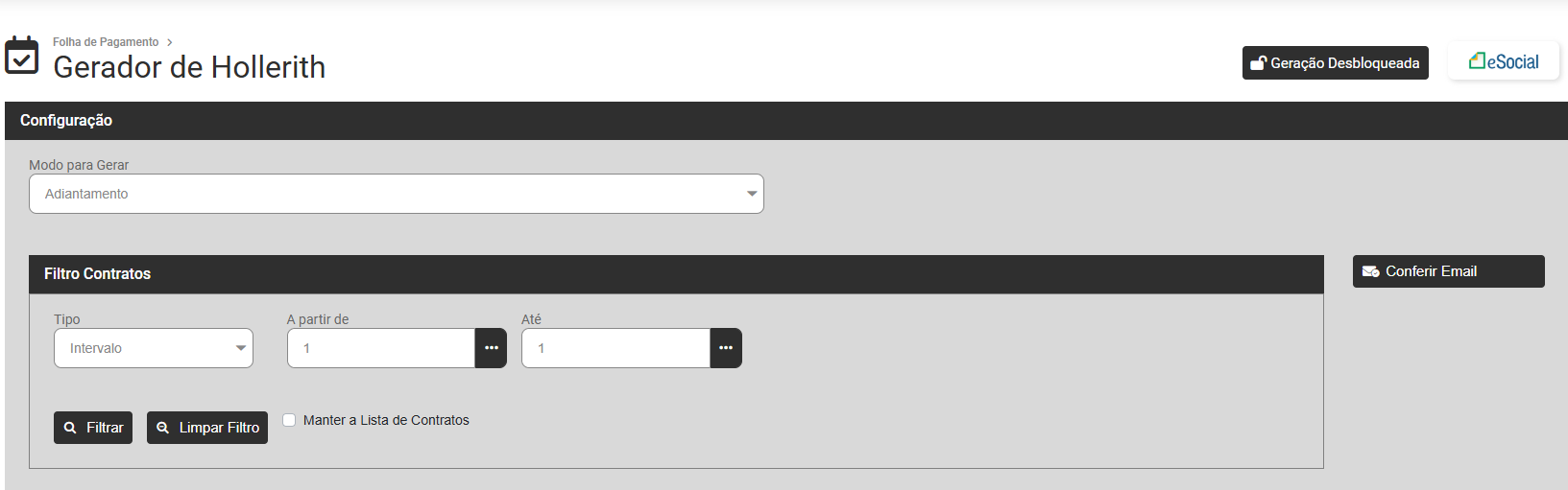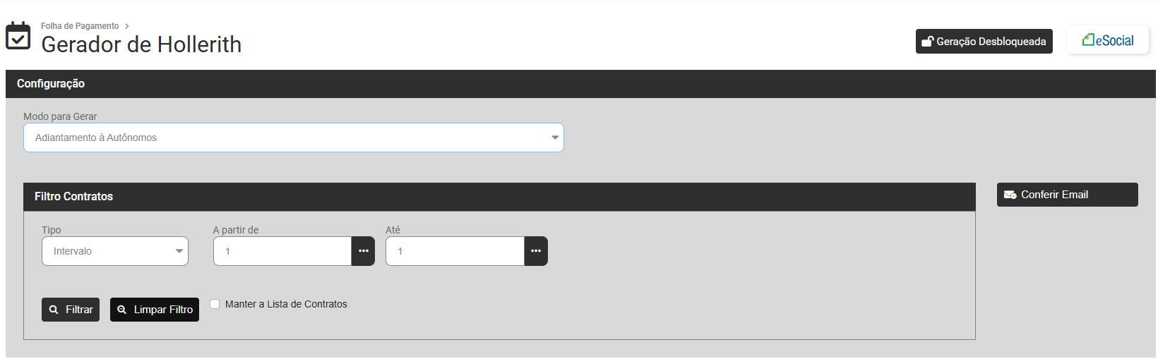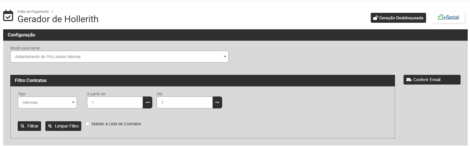 Para a Geração de Mensal dos Funcionários de sua Empresa defina o Modo Mensal e o Sistema irá apresentar a tela para que você defina o Filtro dos Contratos que terão Mensal gerados.