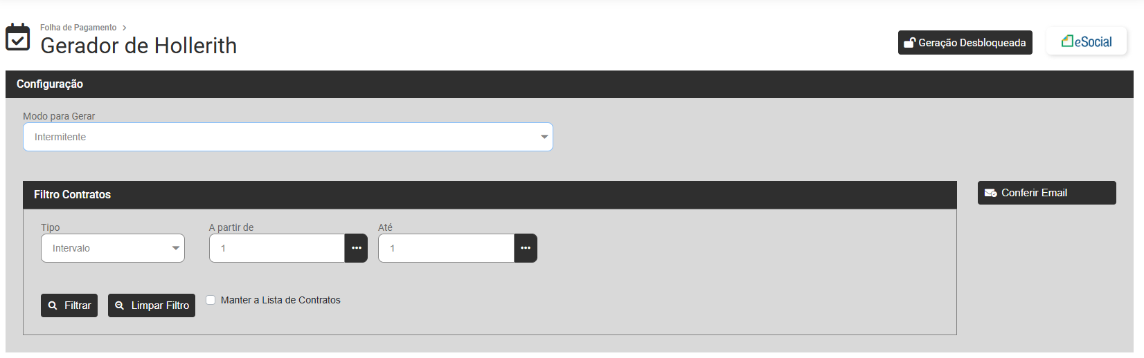 Para a Geração de Pagamento de Intermitente de sua Empresa defina o Modo Intermitente e o Sistema irá apresentar a tela para que você defina o Filtro dos Contratos que terão Pagamento de Intermitente gerados.