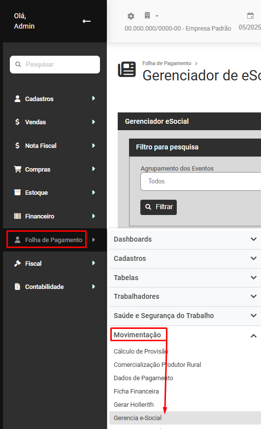 Para que você acesse o Gerenciamento do eSocial entre no menu Folha de Pagamento>Movimentação>Gerencia eSocial