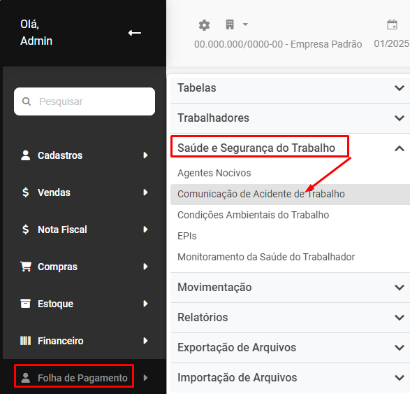 Para realizar a Importação do XML da CAT (Comunicação de Acidente de Trabalho) de seu trabalhador, você deverá acessar o menu Folha de Pagamento>Saúde e Segurança do Trabalho>Comunicação de Acidente de Trabalho
