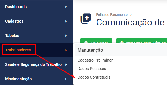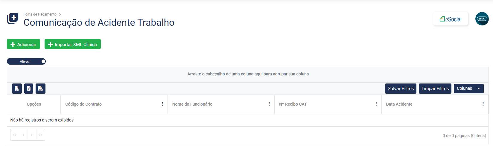 Quando você cadastrar a CAT para o Trabalhador poderá visualizá-la também no menu Folha de Pagamento>Trabalhadores>Dados Contratuais