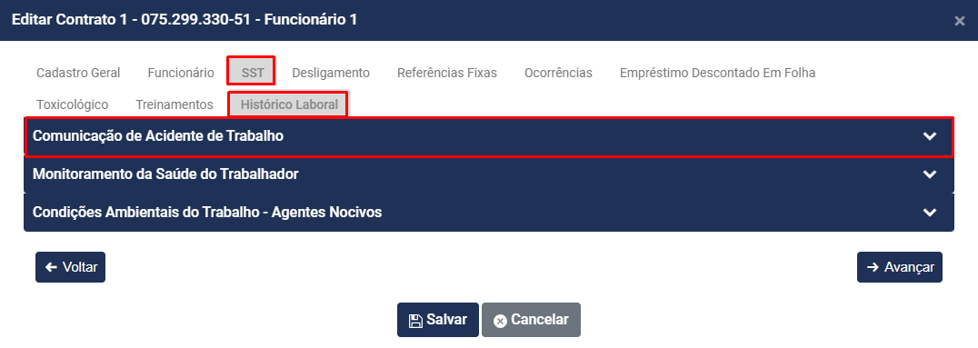 Aba SST>Histórico Laboral>Comunicação de Acidente de Trabalho