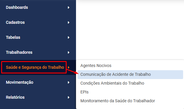 - Cadastro da CAT (Comunicação de Acidente de Trabalho)