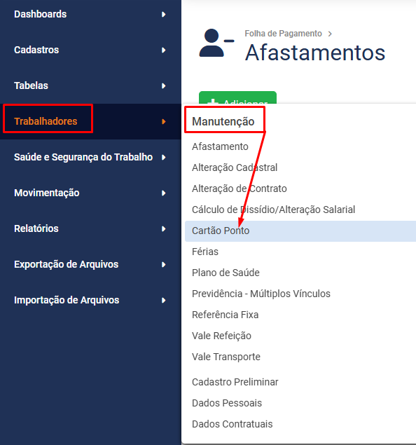 Para Importar o Cartão Ponto dos Trabalhadores da Empresa você deverá acessar o menu Folha de Pagamento>Trabalhadores>Manutenção>Cartão Ponto