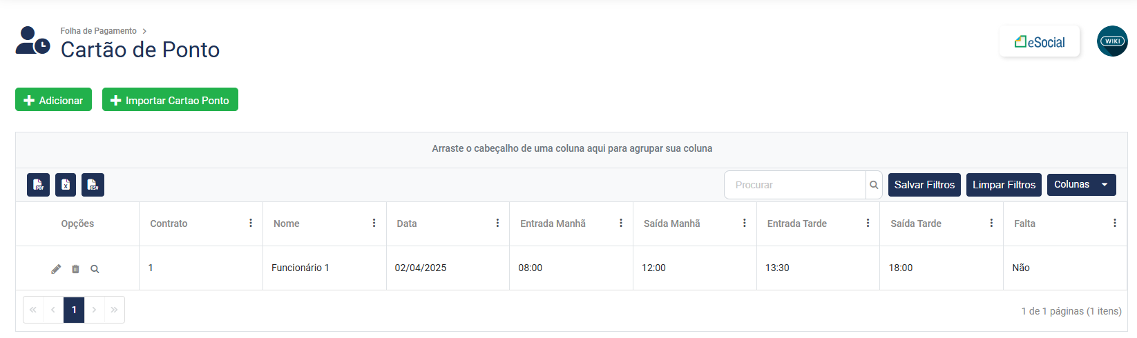 Quando você realizar a importação do Cartão Ponto, as informações ficarão gravadas no Cartão Ponto do trabalhador, menu Folha de Pagamento>Trabalhadores>Cartão Ponto