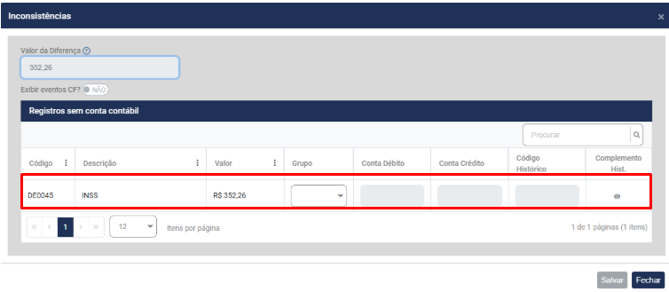 Depois que você cadastrar as Contas Contábeis para todos os Eventos que apresentaram inconsistência, Salve a informação