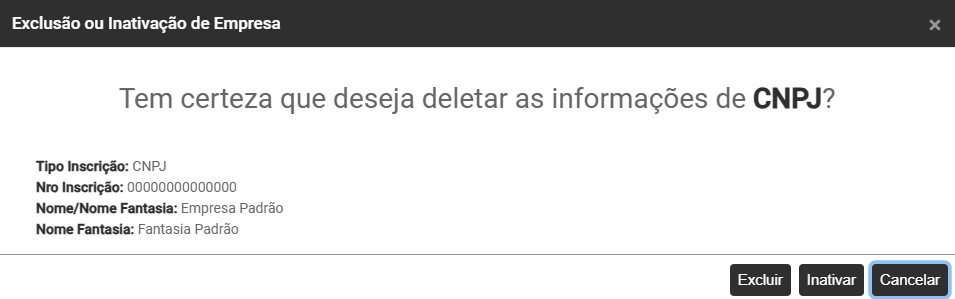 Ao clicar no Botão para Exclusão de Empresa, o Módulo irá apresentar a tela para que você confirme a exclusão da mesma.