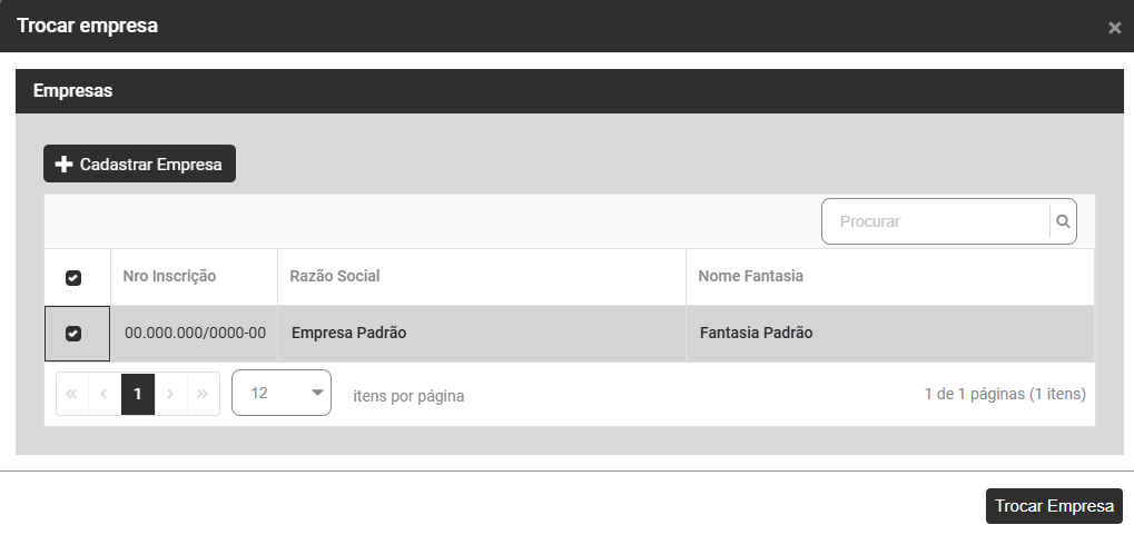 Para que você consiga acessar a Lista de Empresas cadastradas no Módulo, deverá antes selecionar uma Empresa, para isso, no momento em que você acessar o Módulo será apresentada a tela com as Empresas já cadastradas, Selecione a Empresa e em seguida clique em Trocar Empresa