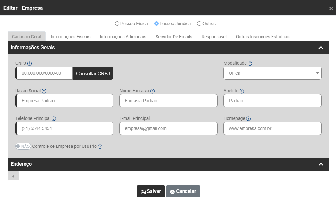 Ao Editar uma Empresa será possível corrigir informações que foram cadastradas erroneamente no Módulo